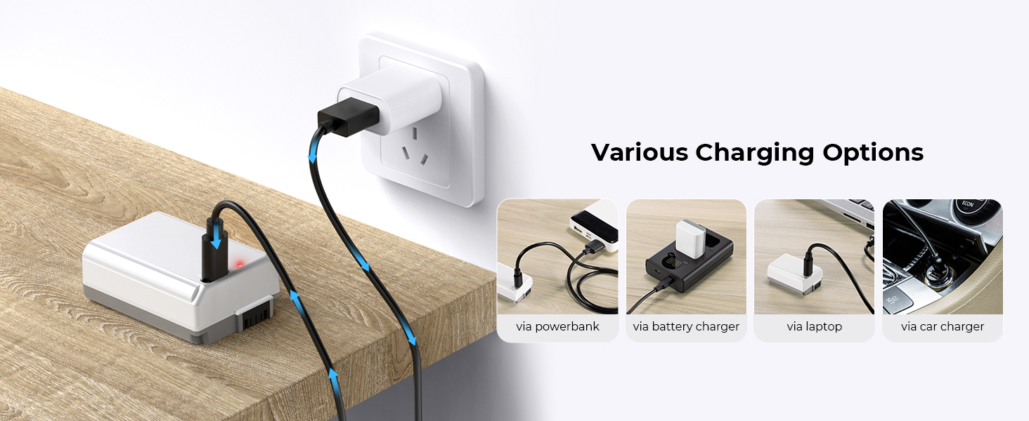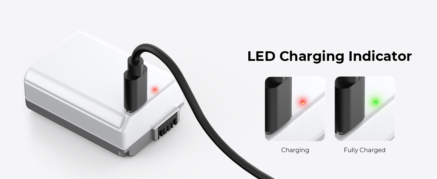 • Дополнительные варианты зарядки его можно заряжать напрямую с помощью зарядного кабеля типа C, а также совместимо со специальным зарядным устройством NP-FW50 для зарядки; его можно заряжать с помощью настенного зарядного устройства USB, автомобильного зарядного устройства или внешнего мобильного источника питания. На аккумуляторе имеется индикатор зарядки: красный свет означает, что идет зарядка, зеленый свет означает, что аккумулятор полностью заряжен.