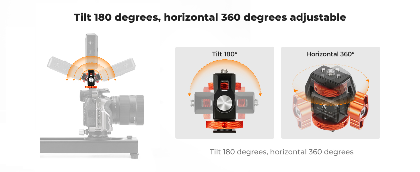 • Широкие возможности позиционирования: поддерживает поворот на 180° по вертикали и 360° по горизонтали. Можно установить смартфон, дополнительный свет или синхронизировать с камерой.