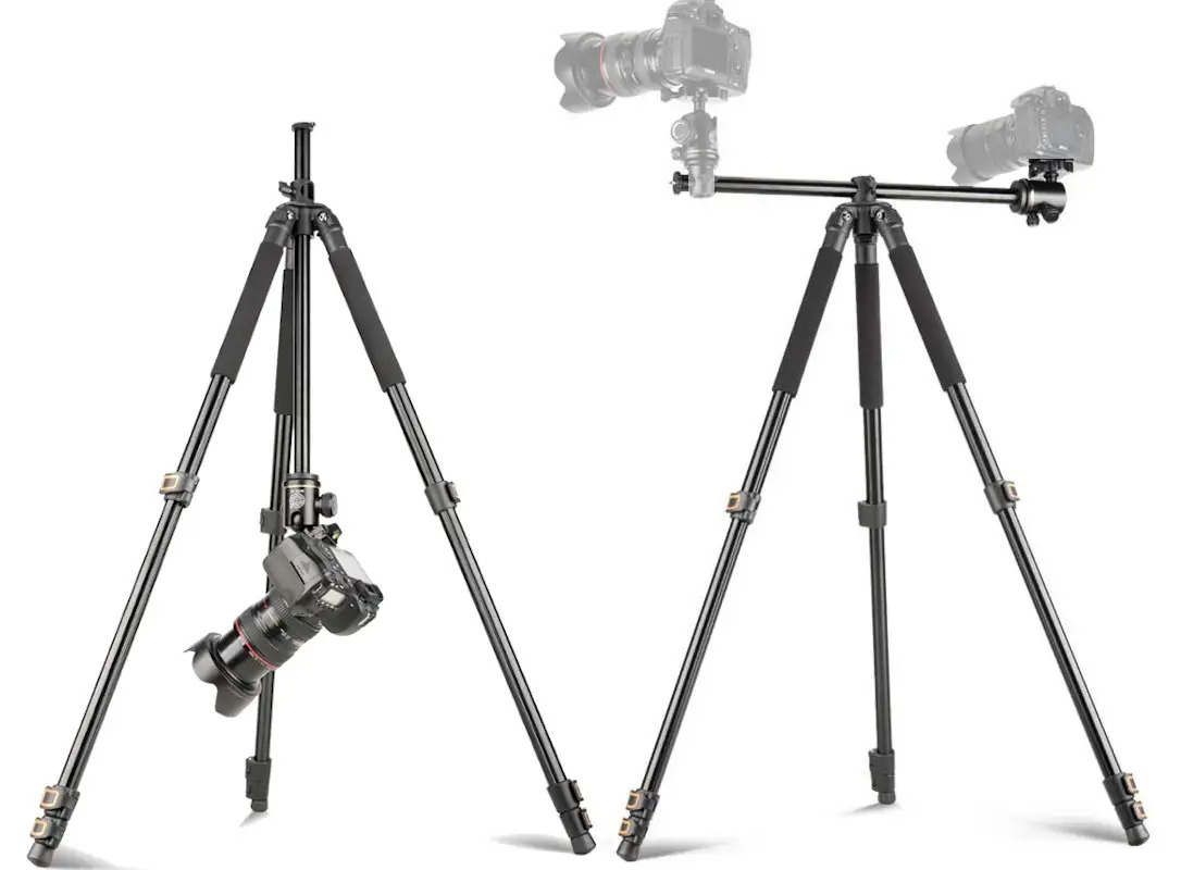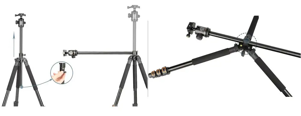 Профессиональный штатив для вертикальной и горизонтальной съемки с многофункциональной шаровой головкой и возможностью обратного крепления.
