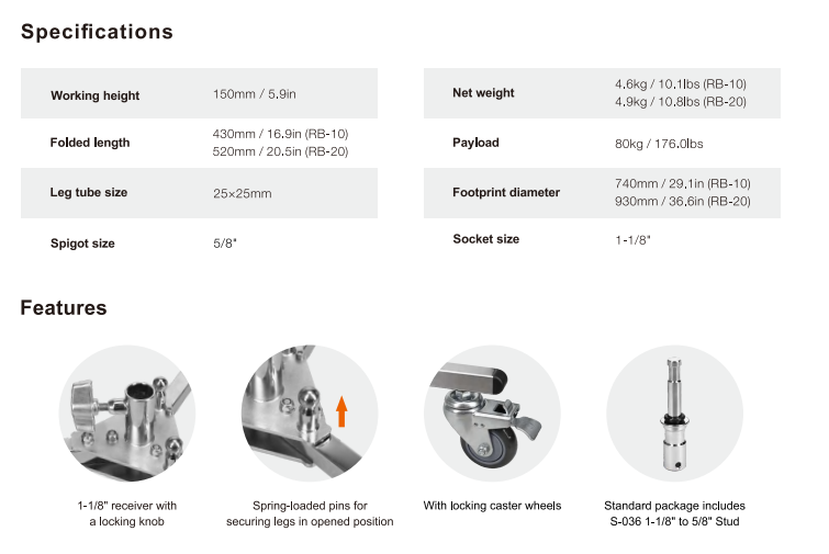 Модель RB-10 решает проблему мобильности тяжелого оборудования. Вместо того чтобы переносить тяжелые C-Stand в руках, вы можете просто перекатить их. Низкий профиль базы позволяет устанавливать осветительные приборы очень низко над полом (для подсветки фона или создания эффекта "света снизу"), используя соответствующий адаптер. Надежные фиксаторы гарантируют безопасность даже для дорогой кинотехники.