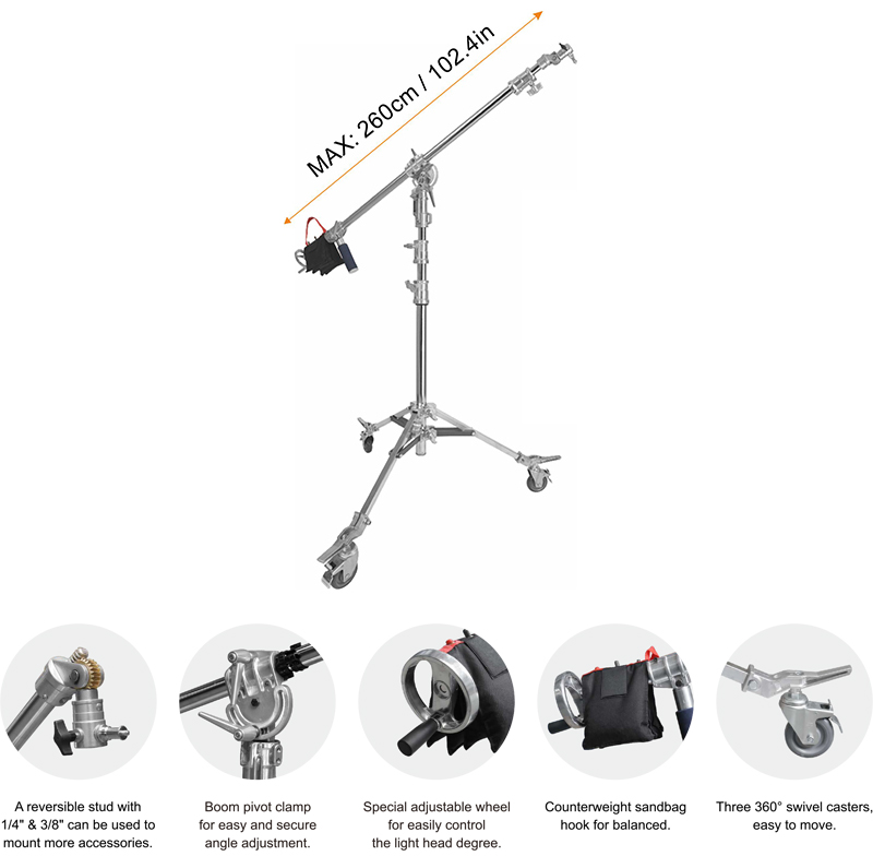 Стальная стрела длиной 260 см снабжена удобной ручкой, которая упрощает регулировку положения. Максимальная рабочая высота журавля составляет 226 см, а грузоподъёмность — до 5 кг. Идеально подойдёт для студийного света, микрофонов, небольших приборов.