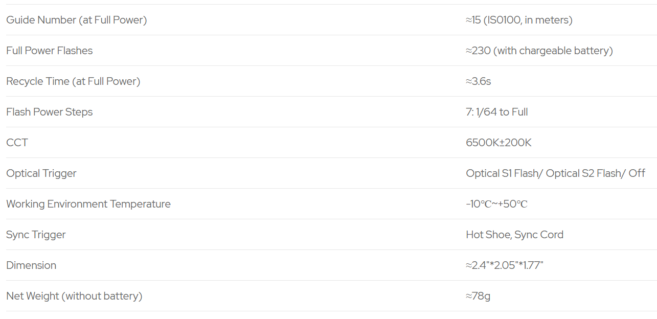 С 7 уровнями мощности (1/64~1/1) и ведущим числом 15 (ISO 100) эта вспышка обеспечивает стабильное и мощное освещение. Быстрая перезарядка и встроенный аккумулятор делают ее удобным решением для фотосъемки в студии и на выезде.